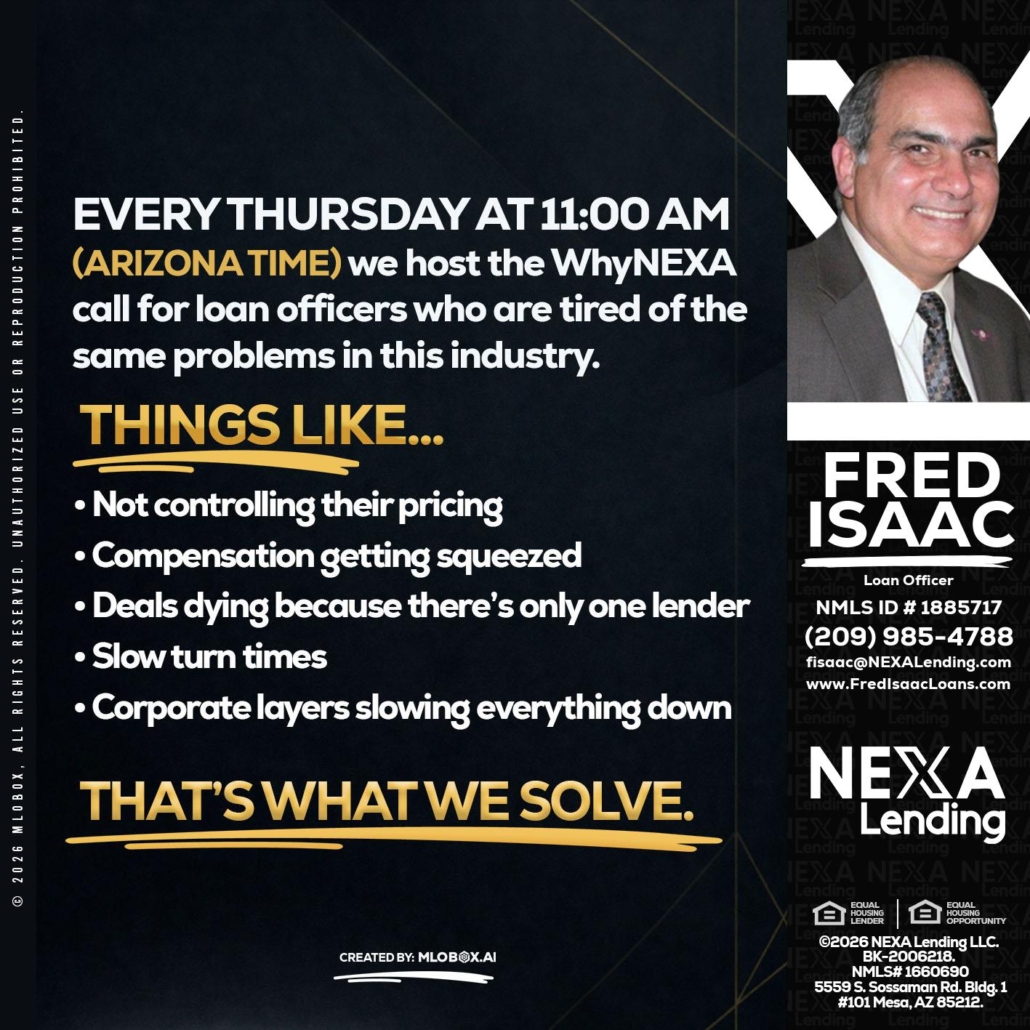 Hi, my name is Fred Isaac. I’m a Loan Officer with NEXA Lending LLC., offering personalized mortgage solutions, fast customized quotes, great rates and service with integrity.