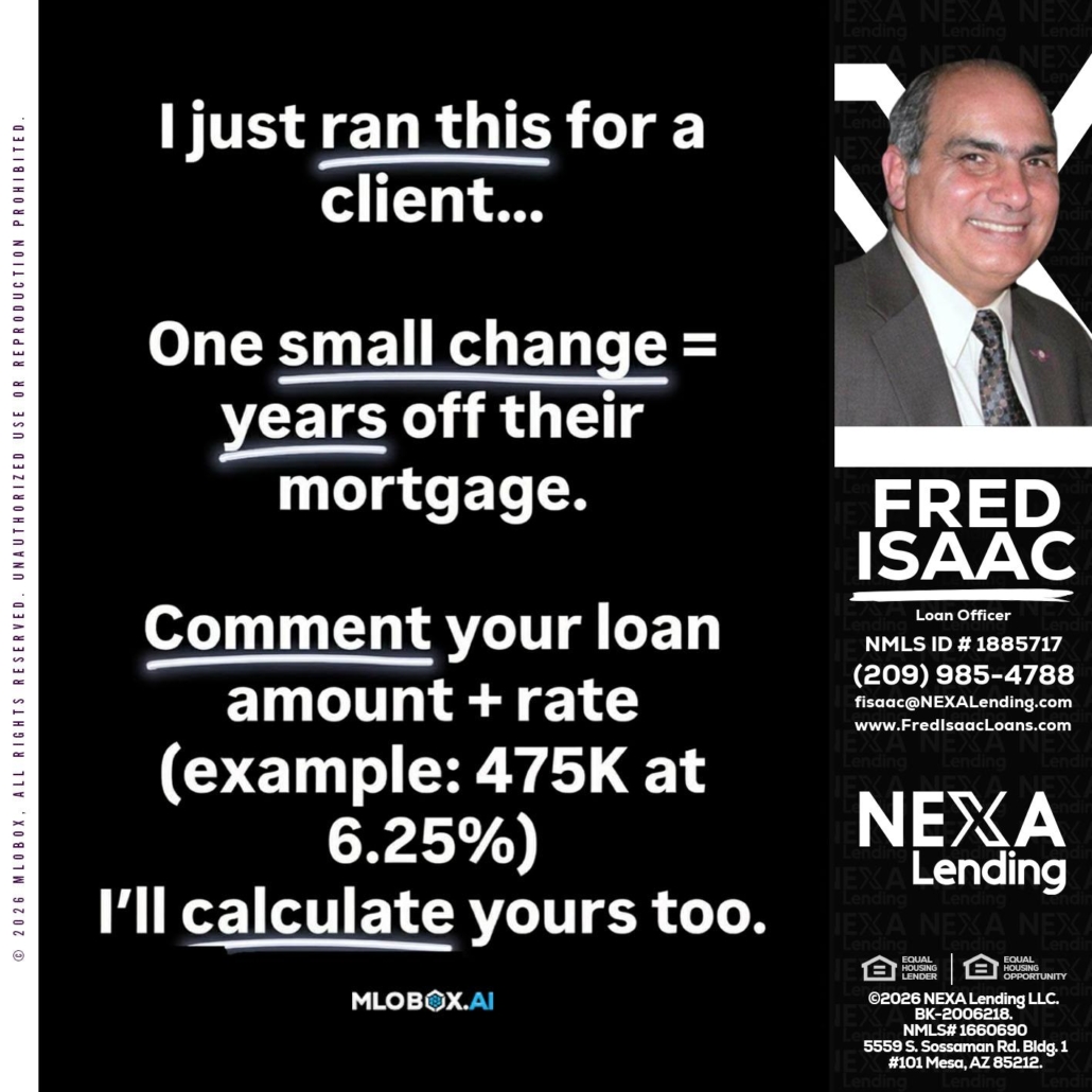 Hi, my name is Fred Isaac. I’m a Loan Officer with NEXA Lending LLC., offering personalized mortgage solutions, fast customized quotes, great rates and service with integrity.